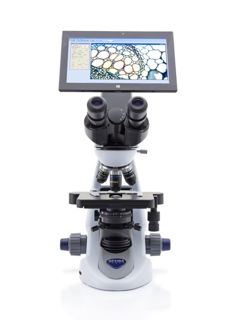 Cuenta con cámara integrada y Tablet de 10.1” full HD extraíble. Estativo metálico de gran estabilidad y ergonomía, para observación con luz transmitida. Tablet con soporte extraíble exclusivo de OPTIKA.